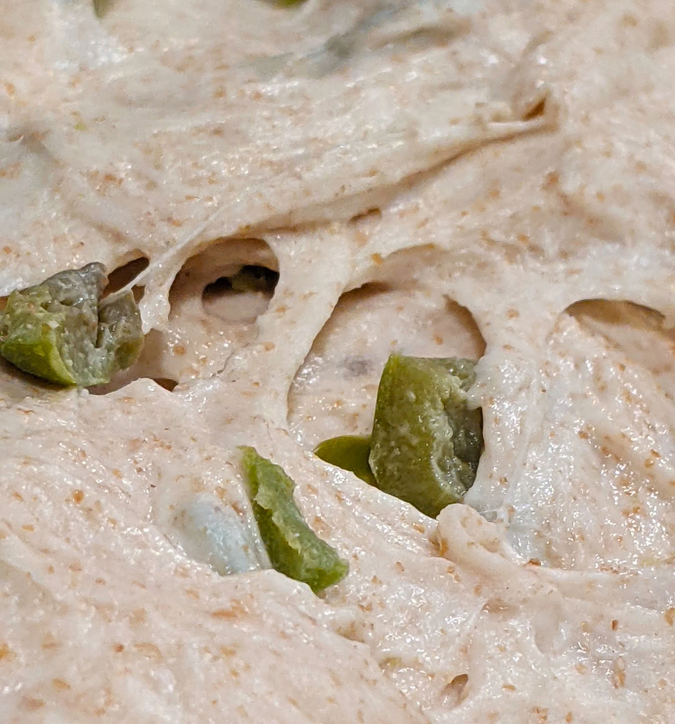 At the end of the stretching and folding you will notice that the dough will become more elastic and the olives should be evenly distributed throughout the dough.